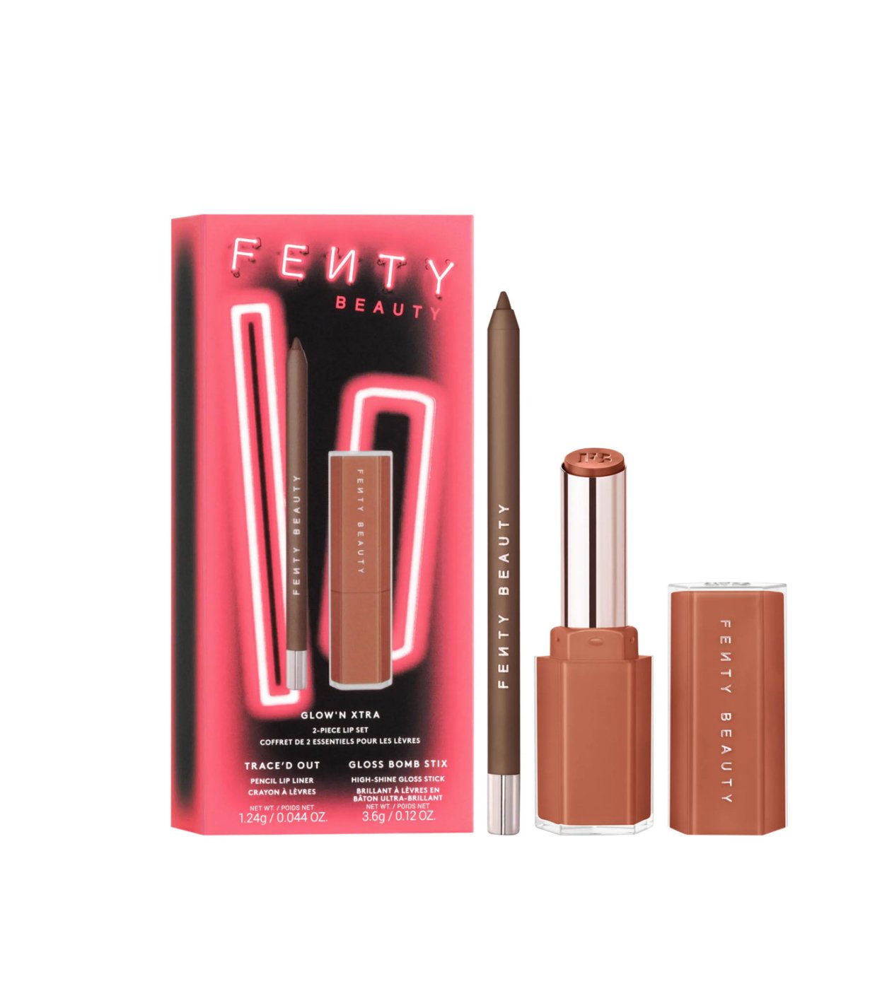This set contains : Traced Out in Extra Thigh (1,24 g) Gloss Bomb Stix in Fenty Glow (3,6 g) Get lit from head to toe with limited-edition beauty must-haves. Light up every room with Fenty Beauty’s electrifying holiday collection. We got everything you need for the ultimate, head-to-toe glow-up. Stunt glossy, shimmering looks, plump, hydrated skin and healthy, shiny hair all season. Give the gift of luminosity, so the whole clique can pull up lookin’ lit. Secure this limited-edition holiday collection and get ready to shine brighter than ever before.