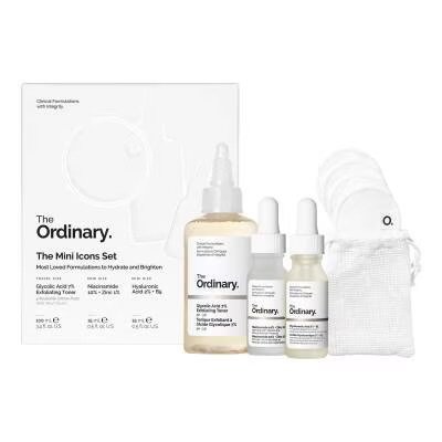 This set contains : A trio of miniature hero products, with complementary cotton pads, to brighten and hydrate uneven skin tone. The Mini Icons Set includes three miniature sizes of some of our most-loved formulations, ideal for travel. The set also includes The Ordinary complimentary reusable cotton pads to support the application of Glycolic Acid 7% Exfoliating Toner. Glycolic Acid 7% Exfoliating Toner is a water-based, exfoliating toner formulated with 7% glycolic acid, a proven alpha-hydroxy acid (AHA) that effectively exfoliates the skin. The daily surface exfoliator helps to remove dead skin cells to smooth skin texture, even tone and boost luminosity. Niacinamide 10% + Zinc 1% is universal serum that balances excess oil to help prevent the appearance of blemishes. Niacinamide 10% + Zinc 1% heroes a high concentration of niacinamide, supported with complementary Zinc PCA, for enhanced penetration of this multi-functional ingredient. Hyaluronic Acid 2% + B5 is a lightweight hyaluronic acid serum that brings together five forms of hyaluronic acid to provide instant plumping hydration, while smoothing texture. The additional supporting ingredients of ceramides and pro-vitamin B5 help to restore the moisture barrier to keep hydration locked in.